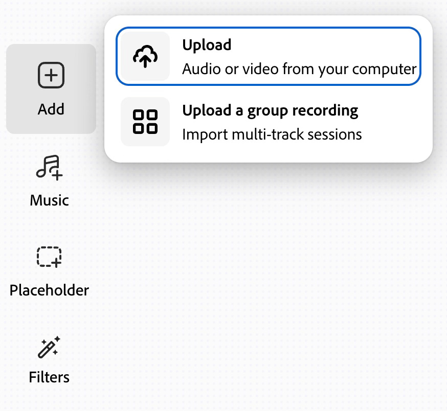 Browse through the available free stock audio, listening to available options to choose something appropriate, or upload your own music (beware of copyright, you can’t use it without a license). Then click the + button to add it in. Music can also be added at any point in your podcast.